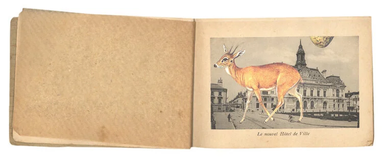In this artists’ book with its monochrome photographic views of Parisian landmarks neatly displayed as tourist’s souvenir to pocket, proportion has once more become a source of play as animals enter stage right. Though the gilt lettering on the cover is now faded, the path ahead holds promise.